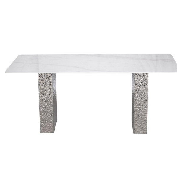 Blat imitacja marmuru;Dekoracyjnie młotkowana stal;Chromowane wykończenie nóg