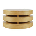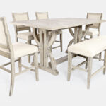 Drewniany stół barowy w stylu rustykalnym w kolorze jasnego drewna. Masywny blat charakteryzuje się intarsją w jodełkę i widoczną strukturą drewna. W zestawie trzy siedziska z beżową tapicerką i ozdobnymi ćwiekami.
