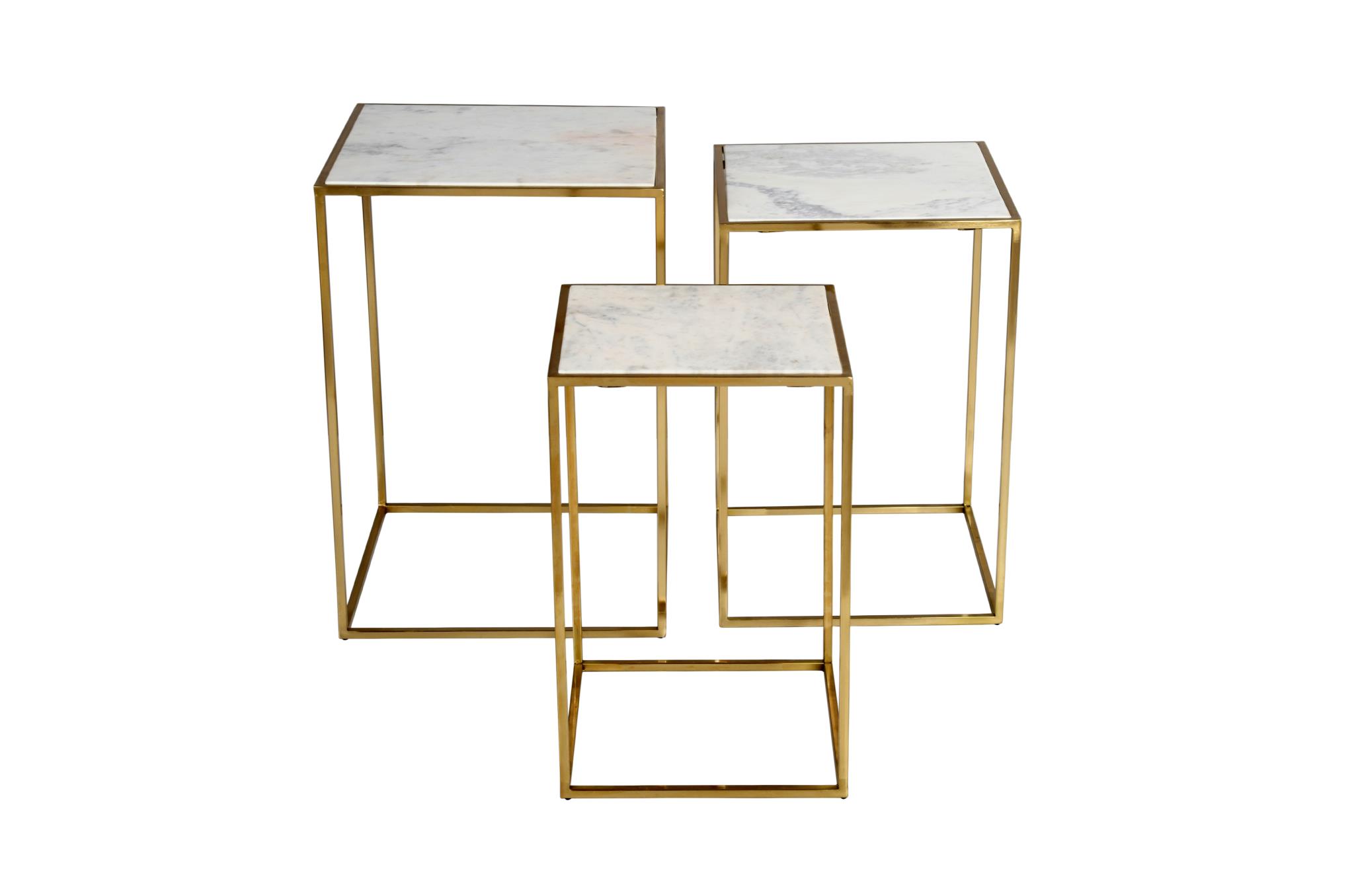 Zestaw stolików z naturalnym, marmurowym blatem w kolorze białym. Konstrukcja o podstawie w kwadratu wykonana jest z metalu w kolorze złotym. Stoliki można złożyć w jedną bryłę, chowając mniejsze w największym.