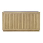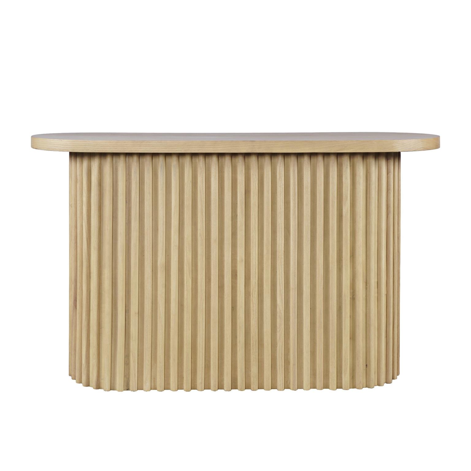 Nowoczesna konsola w stylu Japandi. Podstawa mebla ma kształt owalny a cała powierzchnia jest ryflowana. Masywny blat o spójnym kształcie harmonijnie wpasowuje się w design tego modelu. Widoczna struktura drewna.