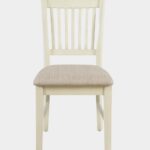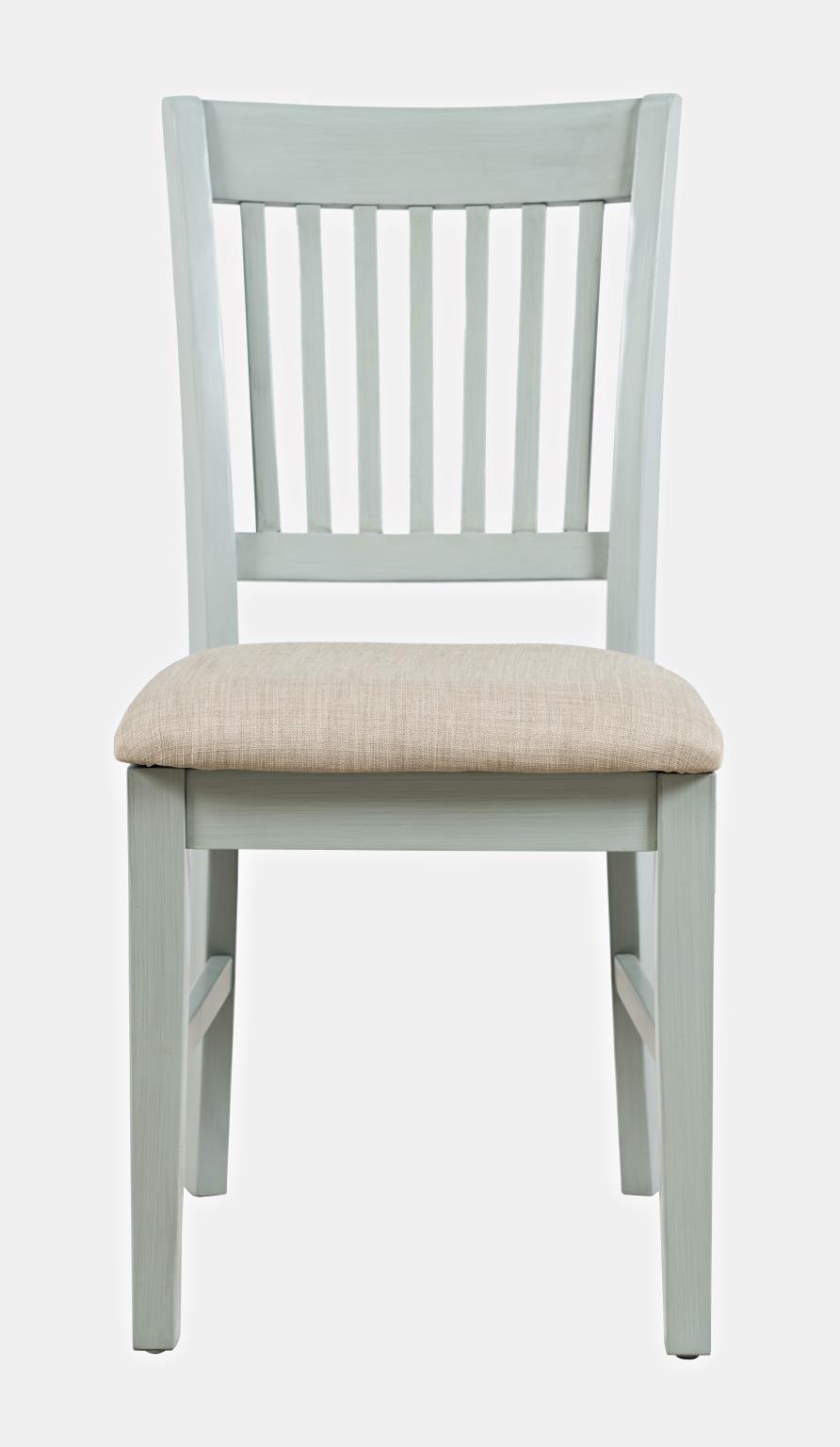 Krzesło tapicerowane w kolorze szaromiętowym. Prostą formę przełamują plecy z pionowymi listewkami oraz kremowe siedzisko tapicerowane.