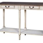 Ława ręcznie malowana w stylu prowansalskim na toczonych nóżkach, posiada metalowy uchwyt w kolorze mosiądzu. Korpus jest w kolorze kremowego półpołysku z przetarciami, szczotkowany blat z frezowanymi krawędziami w kolorze brązowym z widoczną strukturą.