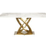 Nowoczesny stół ze złotymi nogami w kształcie geometrycznej bryły przestrzennej wykonane ze stali nierdzewnej oraz białym blatem imitującym marmur.