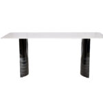 Stylowy stół o podstawie wykonanej ze stali nierdzewnej w kolorze srebrnym. Prostokątny blat w kolorze białym ma wzór imitujący marmur. Podstawa w kształcie złączonych przeciwlegle liter D ma powierzchnię gładką i młotkowaną.