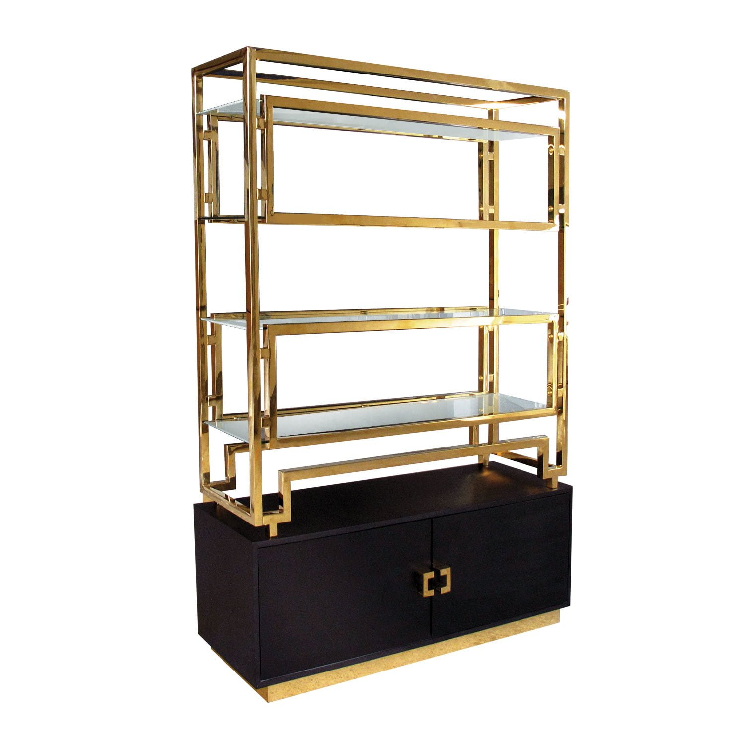 Regał Murano zachwyca precyzją wykonania, jak i nowoczesnym designem. Świetnie nada się do ekspozycji książek, cennych pamiątek i przedmiotów dekoracyjnych. Stylowy i elegancki Regał Murano tworzą dwie części. Górna to złota konstrukcja ze stali nierdzewnej, która posiada szklane półki z ciemnego, hartowanego szkła. W dolnej części regału znajdują się dwie czarne, pojemne szuflady wykonane z drewna. Regał nadaje pomieszczeniu styl i szyk, dzięki ponadczasowemu połączeniu złota i czerni. Szuflady otwierane za pomocą dwóch, złotych uchwytów.