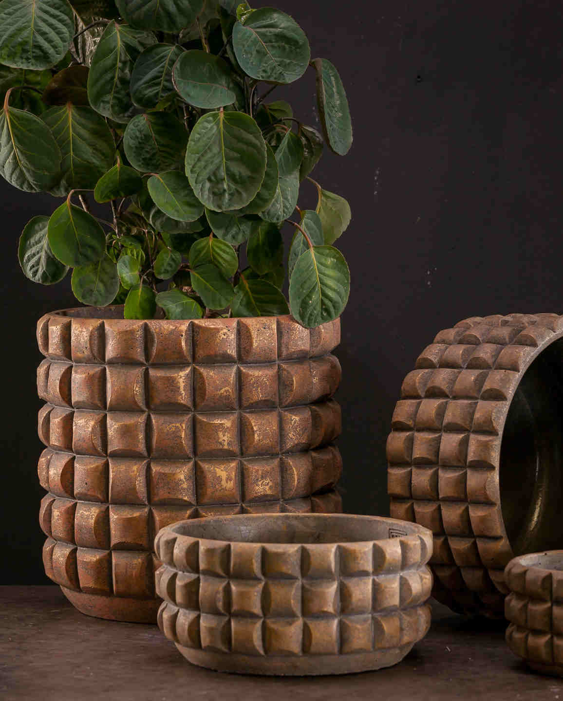 Osłona donicy (misa-L) WILLIAM, marki PTMD wykonana z cementu w czekoladowym kolorze, będzie prawdziwą ozdobą każdego wnętrza. Osłona z zewnętrznym ciekawym kratkowanym wzorem zapewnia jej modny i nowoczesny wygląd, wpisując się zarówno do wnętrz industrialnych, jak i nowoczesnych. Postawiona we wnętrzach z zielonymi roślinami stworzy wyjątkowy klimat.