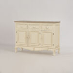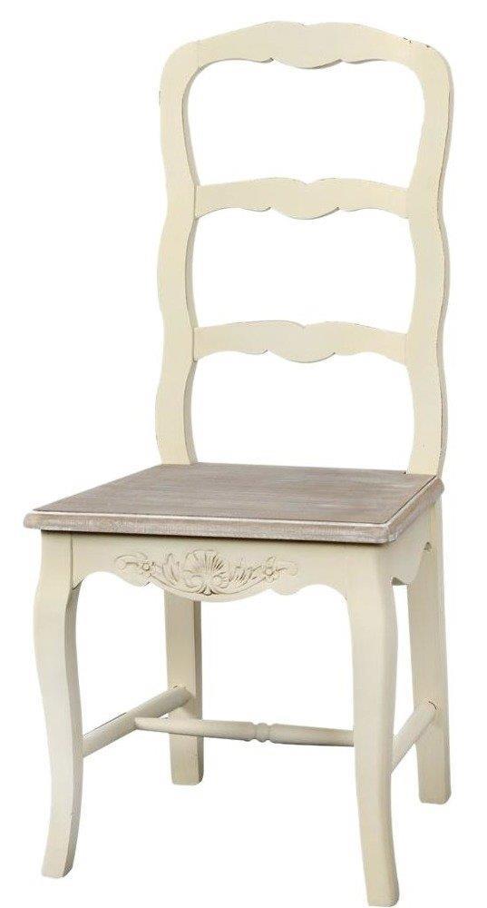 Krzesło w stylu prowansalskim w kolorze kremowym z przecieranym, jasnobrązowym siedziskiem.