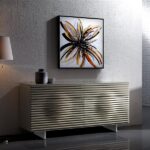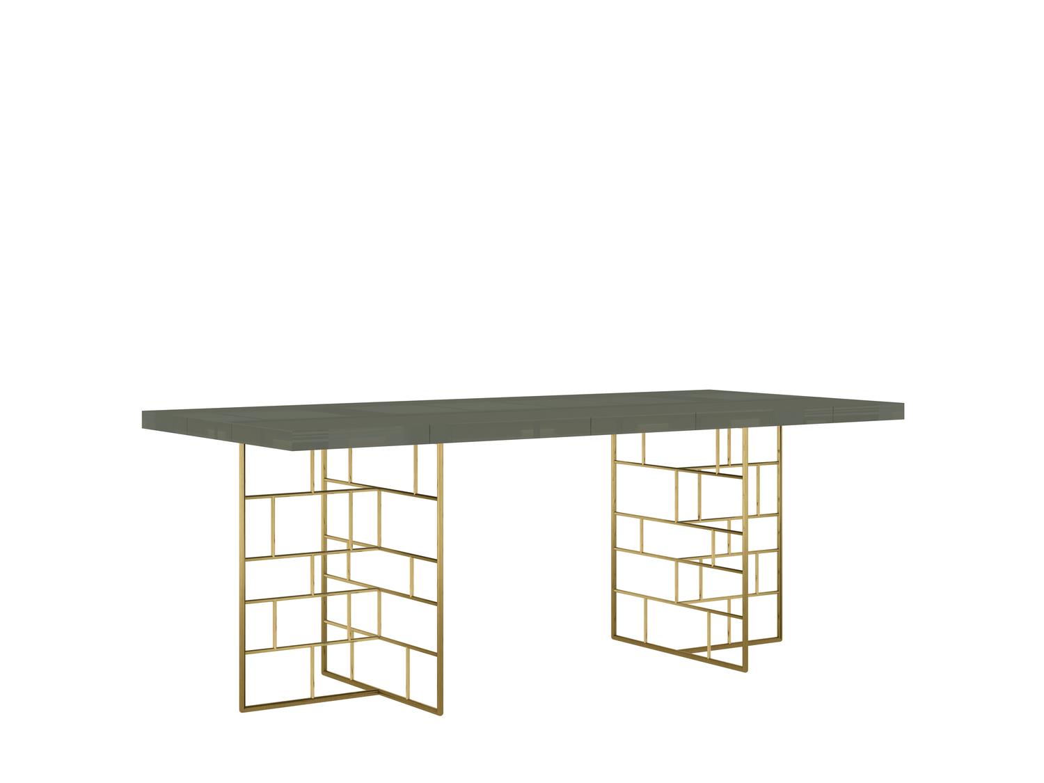 Stół w stylu modern classic z blatem w kolorze cementowej zieleni z kontrastującymi nogami w oryginalnym geometrycznym wzorze w kolorze złota wykonane ze stali nierdzewnej. Blat z płyty MDF w połysku. Minimalistyczna forma bryły tworzy harmonijną całość.